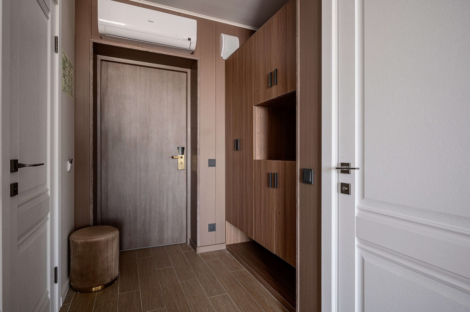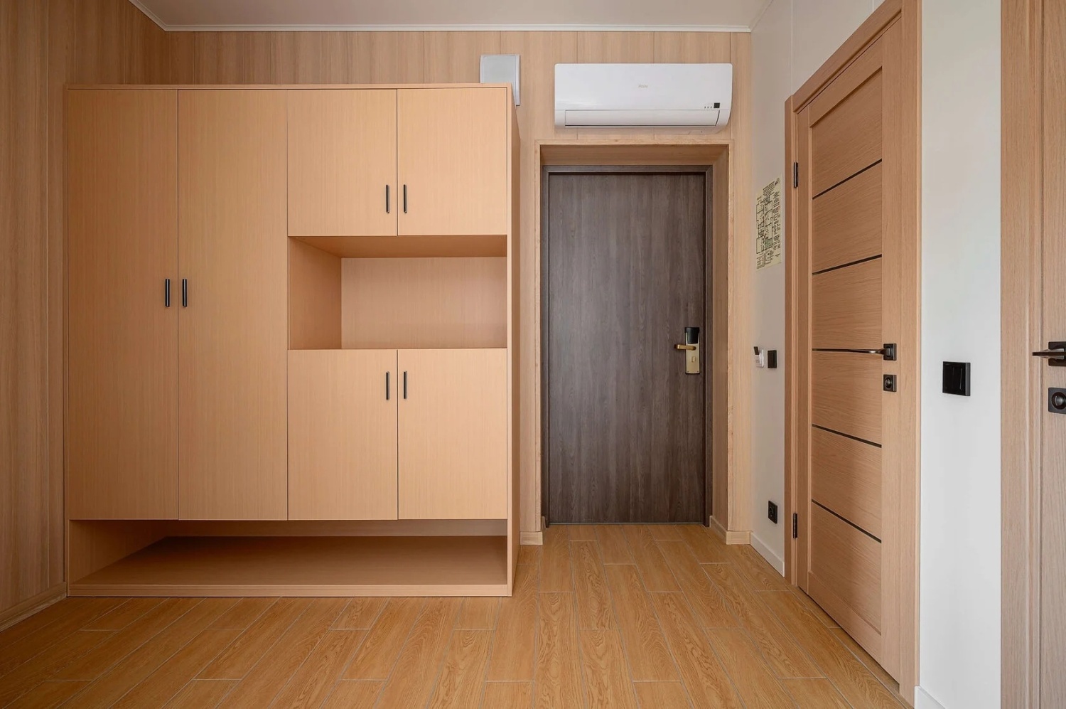 Две односпальные кровати в первой комнате, две односпальные кровати во второй комнате, одна двуспальная в третьей комнате и кухня-гостиная, общая прихожая, кондиционер.Включено в стоимость