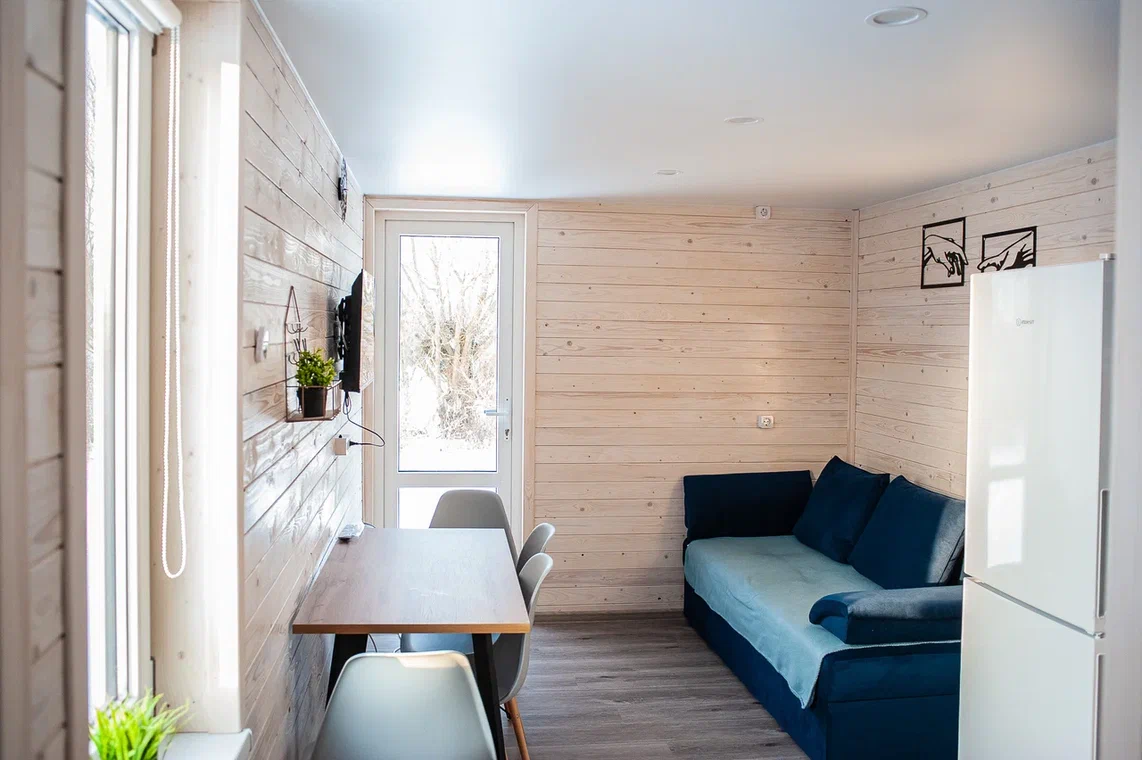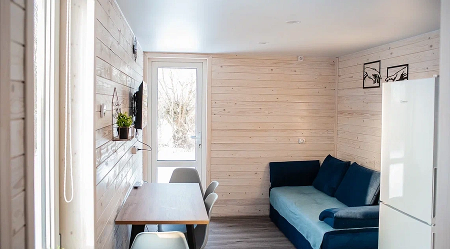 В мини-доме: двуспальная кровать, жалюзи, отопление, вешалка для вещей, раскладной диван для двух гостей (в кухонной зоне), бесплатный wi-fi, Smart TV и кондиционер, холодильник с морозильным отсеком, чайник, микроволновка, газовая поверхность, комплект посуды и столовых приборов на четыре гостя, обеденной стол и четыре стула, вешалки для верхней одежды.Включено в стоимость