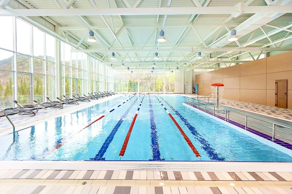 Для пловцов на территории санатория есть бассейн на 4 плавательные дорожки с детской зоной. Из крытого помещения открывается великолепный вид на горные пики Хибин - за это отвечают большие панорамные окна.