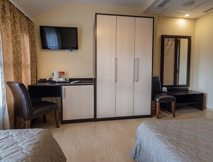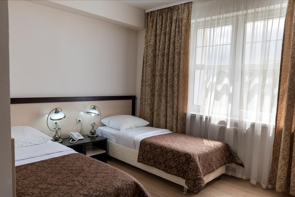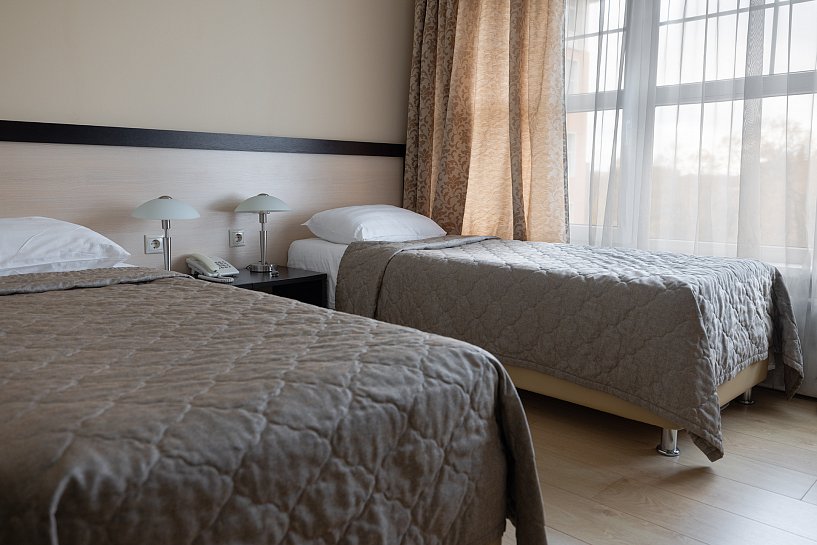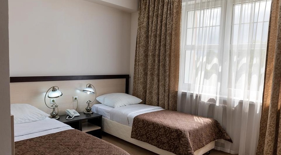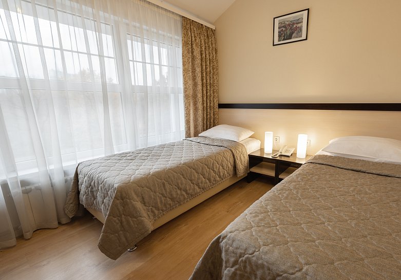 Номер с двумя односпальными кроватями, компактный и эргономичный, площадью от 12м² до 16м². Возможно одноместное и двухместное размещение. Вид в парк и во двор.Включено в стоимость