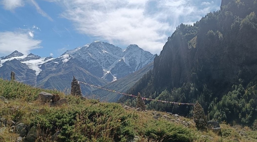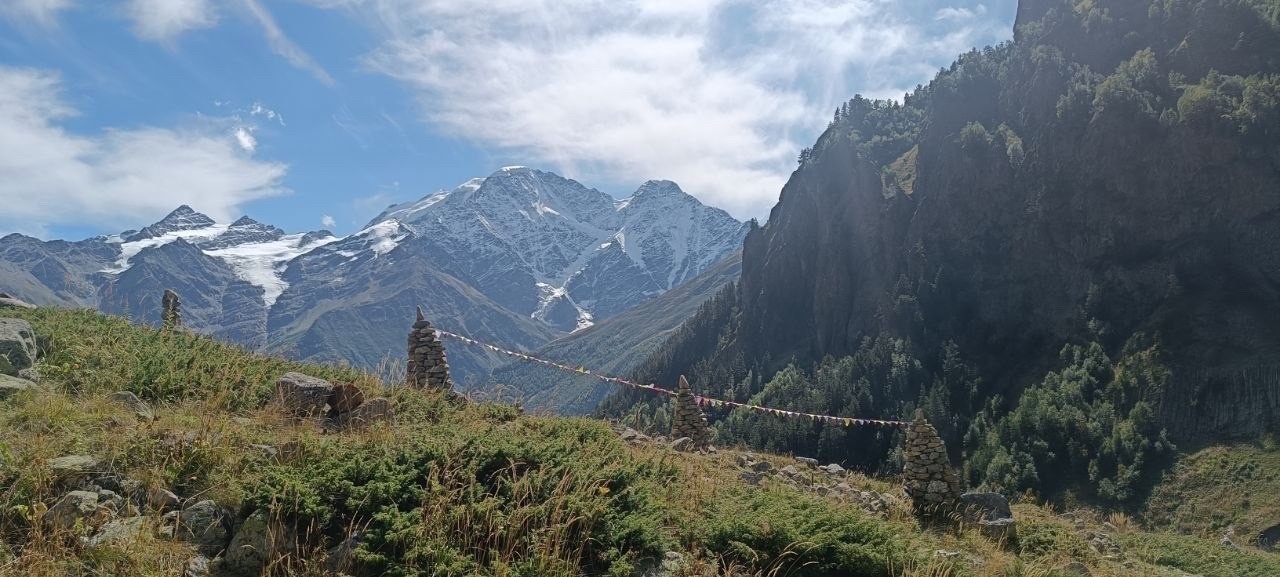 Высокогорная база, рядом горные реки и тропы, водопад и поляна нарзанов с источниками и кафе/ресторанами