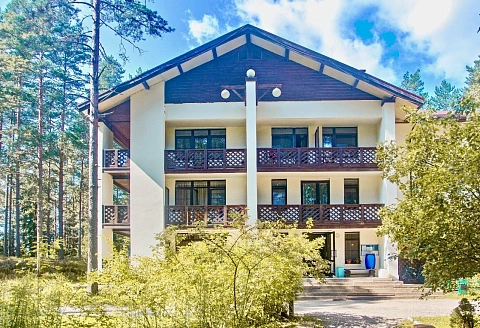 Отель на берегу Псковского озеро со спортивным залом 19×42 м и потолками 10 м. На территории также бассейн, тренажёрный зал и банный комплекс.